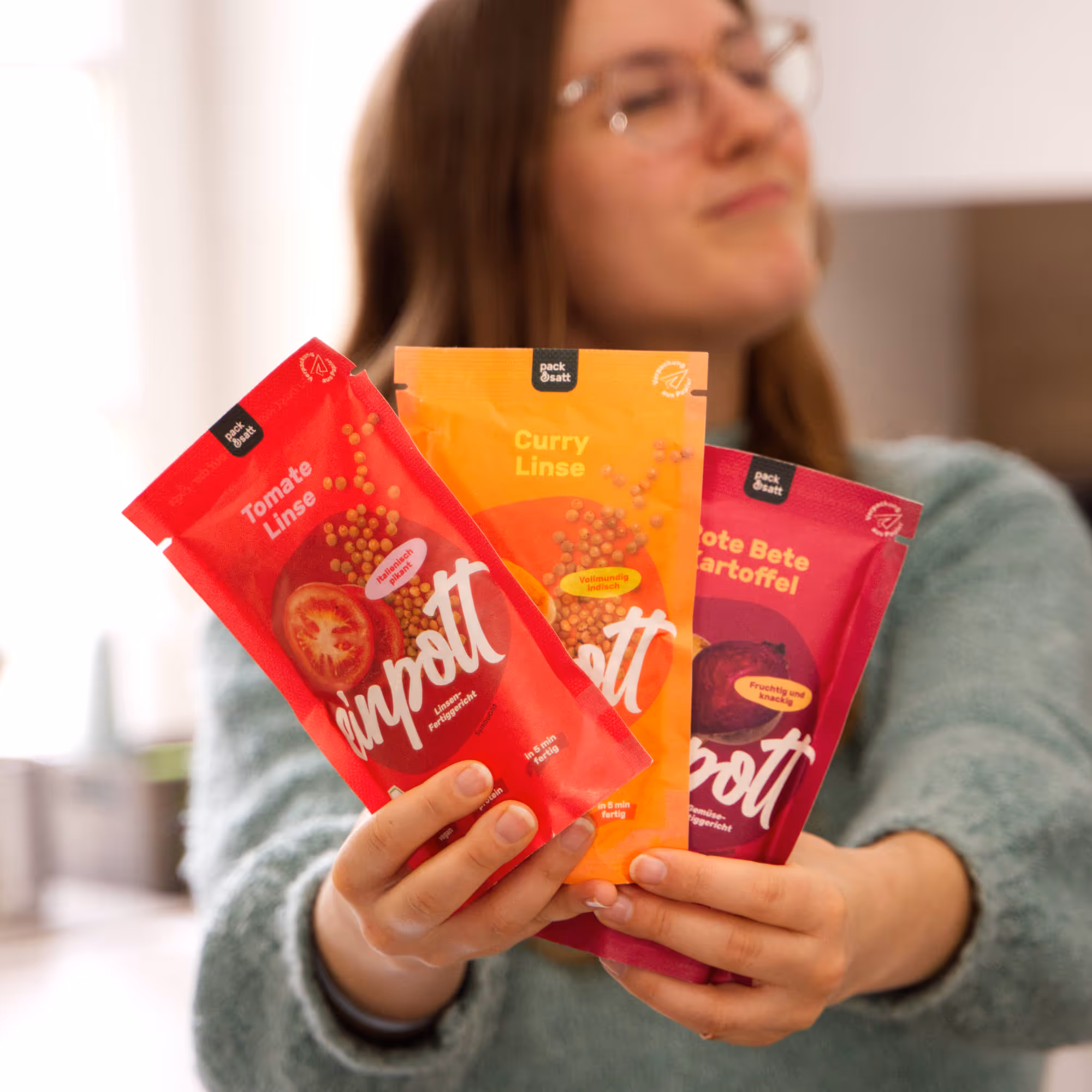 Nachhaltig genießen, ohne Plastikmüll und schlechtes Gewissen. Mit einem einpott isst du nicht nur besser, du entscheidest dich auch für weniger Verpackung und mehr Verantwortung. Die Mahlzeiten kommen im plastikfreien Papierbeutel (lässt sich im Altpapier entsorgen, 100% recyclebar, einzigartig nur bei unserem einpott), sind ungekühlt haltbar und werden in Deutschland produziert und abgefüllt. pack&satt zeigt: Gutes Essen geht auch anders – nachhaltig, unkompliziert und richtig lecker. Probier’s aus – und schmeck den Unterschied.